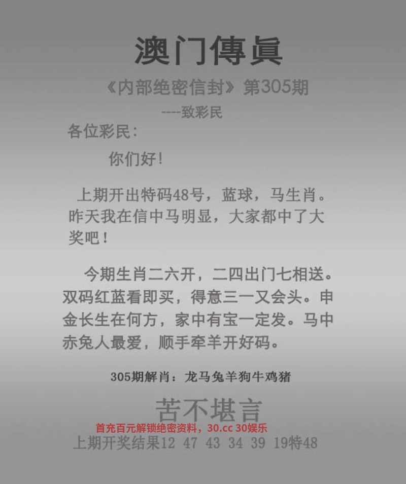 305期澳门马会传真:今期生肖二六开,二四出门七相送。双码红蓝看即买,得意三一又会头。申金长生在何方,家中有宝一定发。马中赤兔人最爱,顺手牵羊开好码。